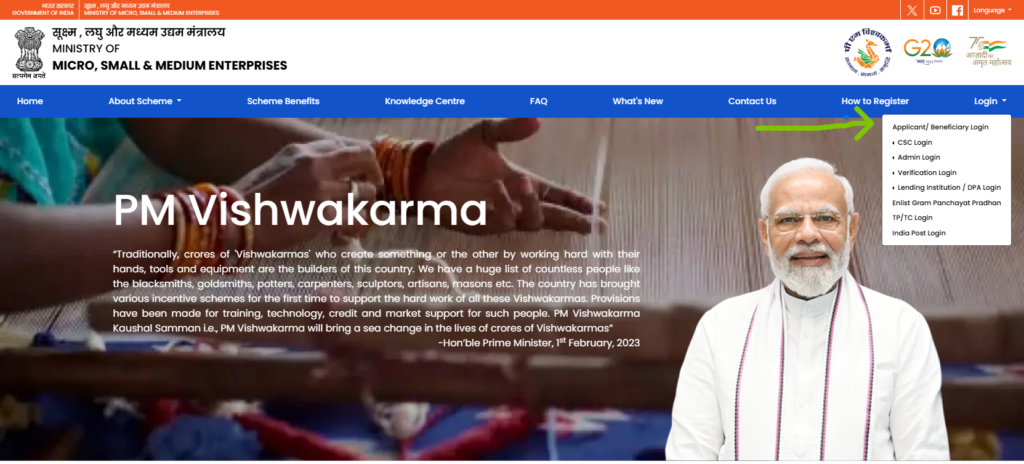 પીએમ વિશ્વકર્મા જેવું તમે google માં જઈને સર્ચ કરશો એટલે તમને એક નીચે વેબસાઈટ જોવા મળશે પહેલી જ વેબસાઈટ તમને જોવા મળશે એ વેબસાઈટ પર તમારે ક્લિક કરવાનું છે વેબસાઈટ પર જેવું જશો એટલે ત્યાં તમને એક ઓપ્શન ત્યાં જોવા મળશે એપ્લિકેશન એન્ડ બેનિફિશ્યરી એપ્લાય આ ઓપ્શન પણ તમારે ક્લિક કરવાનું છે